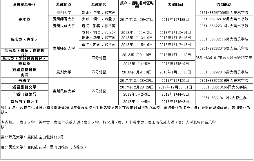 貴州省2018年普通高等學(xué)校藝術(shù)類專業(yè)考試時(shí)間表